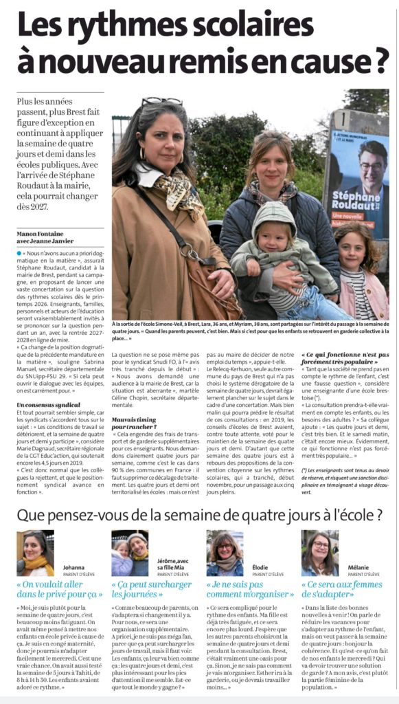 Suite à la convention citoyenne sur le temps de l’enfant, le combat n’est pas terminé et même les écoles à 4 jours actuellement sont « menacées » puisqu’il s’agit d’une dérogation, le cadre légal étant la semaine à 4.5 jours.