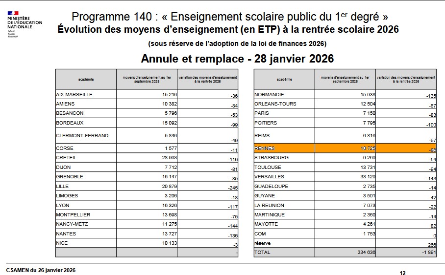 CSA Ministériel: carte scolaire rentrée 2026/2027