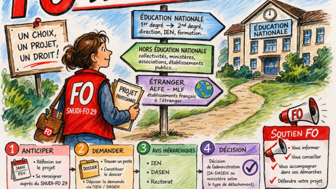 Le détachement permet à un professeur des écoles titulaire d’exercer dans un autre corps, une autre administration ou un autre organisme tout en conservant ses droits dans son corps d’origine (ancienneté, retraite, carrière).