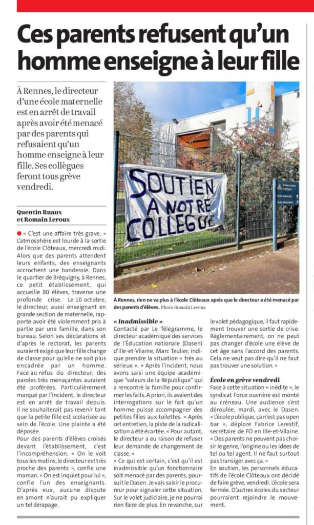 Situation symptomatique à Rennes: des parents ne veulent pas d’un enseignant homme pour leur fille de GS. 11/23/2025 snudi29 CSA Académique, Dossiers thématiques, F3SCT (ex CHSCT) 0 Protection des personnelsTélécharger De plus en plus on assiste à l’école à la carte!